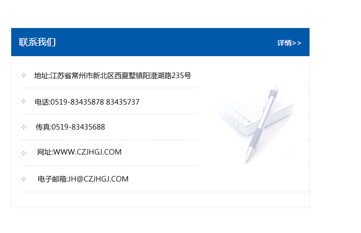 地址:常州市新北區友邦商務大廈1幢16、17層  電話:0519-85101652  傳真:0519-85112595  郵編:213022  網址:www.cz-jiayue_cn.xexljy.com  郵箱:xiajifengaa@163.com